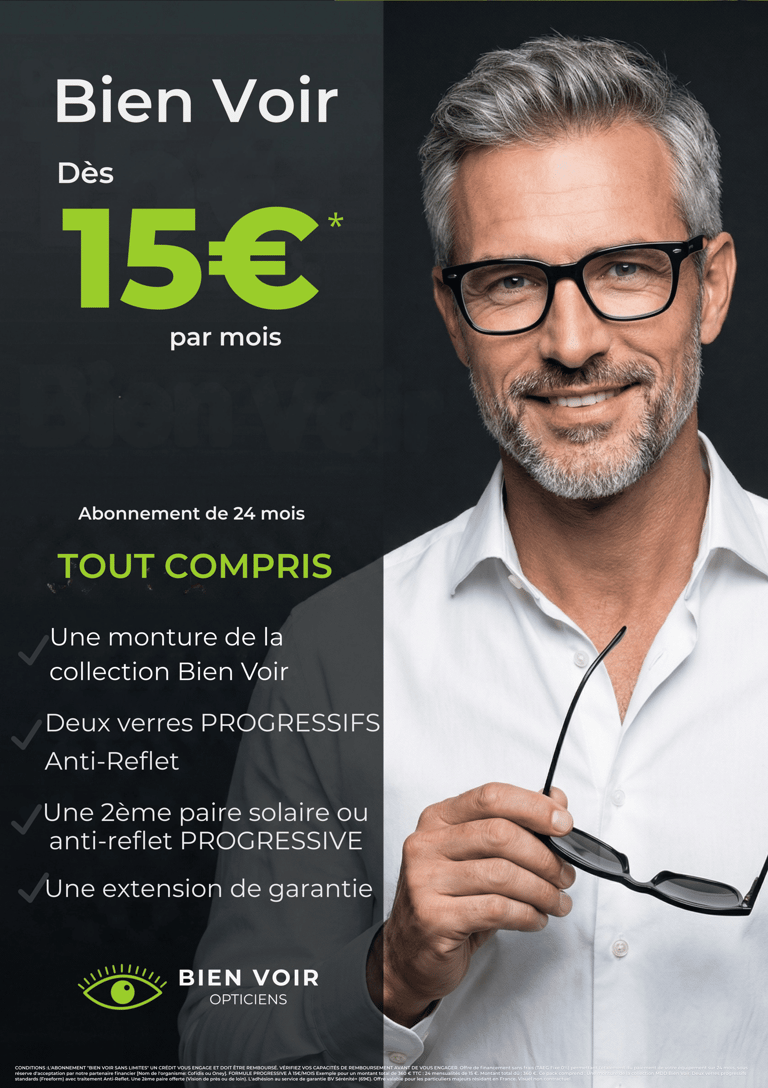 CONDITIONS :L'ABONNEMENT "BIEN VOIR SANS LIMITES" UN CRÉDIT VOUS ENGAGE ET DOIT ÊTRE REMBOURSÉ. VÉRIFIEZ VOS CAPACITÉS DE REMBOURSEMENT AVANT DE VOUS ENGAGER. Offre de financement sans frais (TAEG Fixe 0%) permettant l'étalement du paiement de votre équipement sur 24 mois, sous réserve d'acceptation par notre partenaire financier [Nom de l'organisme: Cofidis ou Oney]. FORMULE PROGRESSIVE À 15€/MOIS Exemple pour un montant total de 360 € TTC : 24 mensualités de 15 €. Montant total dû : 360 €. Ce pack comprend : Une monture de la collection MDD Bien Voir. Deux verres progressifs standards (Freeform) avec traitement Anti-Reflet. Une 2ème paire offerte (Vision de près ou de loin traitement anti reflet simple ou solaire). L'adhésion au service de garantie BV Sérénité+ (69€). Offre valable pour les particuliers majeurs résidant en France. Visuel non contractuel.