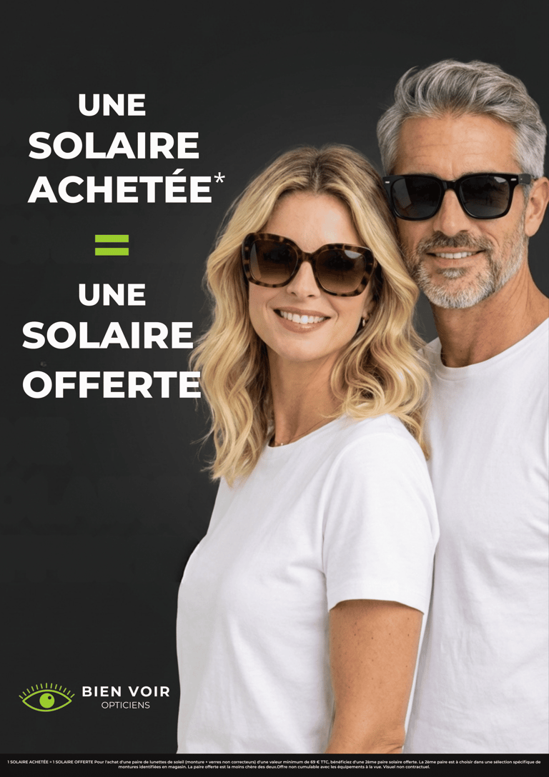 1 SOLAIRE ACHETÉE = 1 SOLAIRE OFFERTE Pour l'achat d'une paire de lunettes de soleil (monture + verres non correcteurs) d'une valeur minimum de 69 € TTC, bénéficiez d'une 2ème paire solaire offerte. La 2ème paire est à choisir dans une sélection spécifique de montures identifiées en magasin. La paire offerte est la moins chère des deux.Offre non cumulable avec les équipements à la vue. Visuel non contractuel.