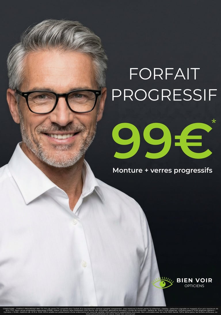 CONDITIONS : FORFAIT PROGRESSIF 99€ TTC Prix de vente TTC conseillé pour l’achat d’un équipement optique complet comprenant : Une monture à choisir parmi la collection « Optika » (sélection signalée en magasin d’un prix maximum de 30 € TTC). Deux verres progressifs organiques (CR39), indice 1.5, blancs, sans traitement (non durcis, non antireflet), géométrie standard. Limites de correction : Sphère de -5.00 à +5.00 dioptries ; Cylindre jusqu’à +2.00 dioptries (Sphère + Cylindre ≤ +5.00) ; Addition de +0.75 à +3.00. Offre valable sur présentation d’une ordonnance en cours de validité. Hors options et suppléments éventuels. Non cumulable avec les tarifs 100% Santé, l'offre 2ème paire, les forfaits unifocaux, ou toute autre promotion en cours; Visuel non contractuel
