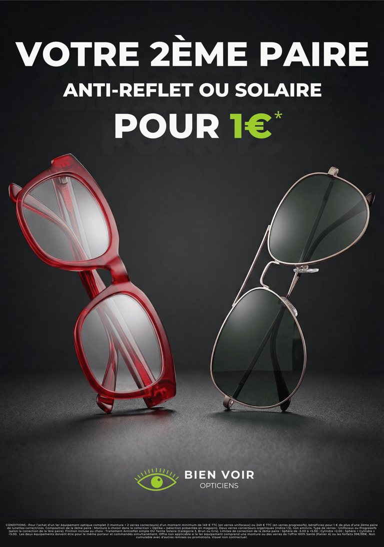 CONDITIONS : Pour l’achat d’un 1er équipement optique complet (1 monture + 2 verres correcteurs) d’un montant minimum de 149 € TTC (en verres unifocaux) ou 249 € TTC (en verres progressifs), bénéficiez pour 1 € de plus d’une 2ème paire de lunettes correctrices. Composition de la 2ème paire : Monture à choisir dans la collection « Optika » (sélection présentée en magasin). Deux verres correcteurs organiques (indice 1.5), non amincis. Type de verres : Unifocaux ou Progressifs (selon la correction de la 1ère paire). Finition incluse au choix : Traitement Antireflet simple OU Teinte Solaire (Catégorie 3, Brun ou Gris). Limites de correction de la 2ème paire : Sphère de -5.00 à +5.00 ; Cylindre +2.00 ; Sphère + Cylindre ≤ +5.00. Les deux équipements doivent être pour le même porteur et commandés simultanément. Offre non applicable si le 1er équipement comprend une monture ou des verres de l'offre 100% Santé (Panier A) ou les forfaits 39€/99€. Non cumulable avec d'autres remises ou promotions. Visuel non contractuel.