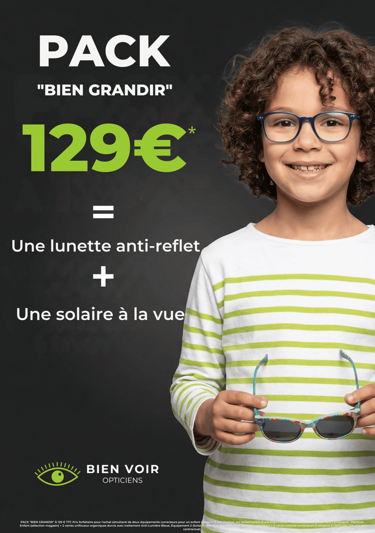 PACK "BIEN GRANDIR" À 129 € TTC Prix forfaitaire pour l'achat simultané de deux équipements correcteurs pour un enfant (jusqu'à 12 ans révolus), sur présentation d'une ordonnance médicale valide. Équipement 1 (Principal) : Monture Enfant (sélection magasin) + 2 verres unifocaux organiques durcis avec traitement Anti-Lumière Bleue. Équipement 2 (Solaire) : Monture Solaire Enfant (sélection magasin) + 2 verres solaires correcteurs (Catégorie 3, 100% UV). Visuel bon contractuel.